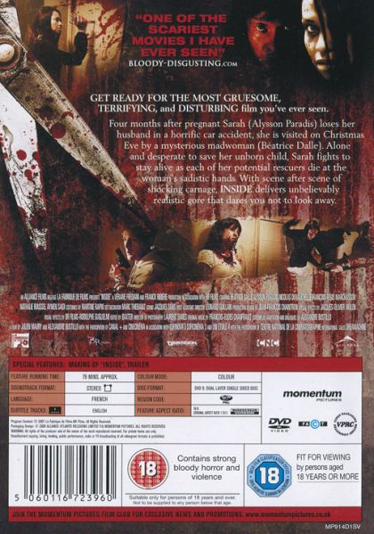 In Paris it's Christmas time, and the suburbs are inflamed by urban guerrilla. Sarah (Alysson Paradis) is a young photographer, pregnant of her first baby. She is expected to delivery in a few days at most. Sarah is alone: unfortunately her boyfriend, the father of the baby, is deceased some months earlier in a gruesome car accident. On Christmas Eve, a mysterious woman (Beatrice Dalle) tries to enter the house and then starts haunting Sarah, clearly manifesting an insane interest for the unborn child. The unknown woman will lead Sarah and the few who dare to face her to a terrifying, bloody battle for the content of Sarah's wombs. No cruelty will be spared.