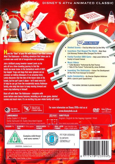 Meet the Robinsons is a computer animated film from Disney. This family adventure centers on a genius orphaned boy, Lewis (Jordan Fry) who, having been rejected by more than 100 potential families, strikes upon a scheme to find out what his real mother looked like. He invents a device that projects memories onto a screen, but before he can use it, it is stolen by a sinister figure from the future, known only as "Bowler Hat Guy" (Stephen J. Anderson). To his aid comes Wilbur Robinson (Wesley Singerman), who can also travel through time and who offers to help Lewis retrieve his memory scanner before Bowler Hat Guy can use it for his evil means. In the future Lewis finds a bright, exciting and vibrant world, as well as a potential family in the shape of the Robinsons. But before he can enjoy his new life, he must stop Bowler Hat Guy before he changes the future forever.