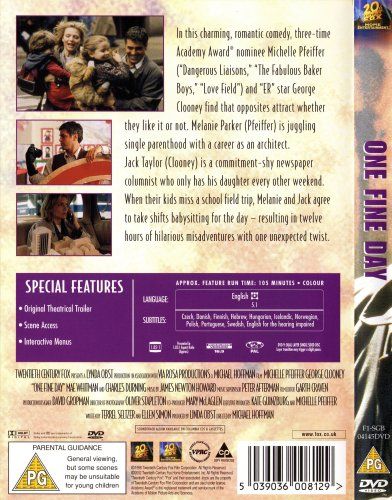 This gentle comedy almost seems like something out of Hollywood's Golden Age, a movie that might have been made by a talented contract director, perhaps featuring Don Ameche and Claudette Colbert. But in fact One Fine Day stars George Clooney as an investigative columnist for a New York newspaper and Michelle Pfeiffer as an architect. Both single parents, the two meet and bicker and develop a relationship over the course of a day while their young children play together. Michael Hoffman (Restoration) directs with a good sense of what's funny about harried caretakers and kids who do whatever they want to do. The story stretches out of shape a bit when Clooney's character has to rally to prove some point of corruption at City Hall; nobody involved seems quite up to making that subplot believable, but all that really matters about this very nice movie is the winning love story. --Tom Keogh