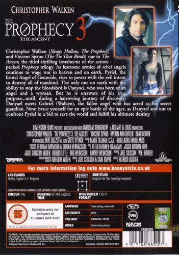 The third and final chapter in the terrifying trilogy that is The Prophecy portrays the warfare that rages on Earth and Heaven and the rise of Pyriel (Scott Cleverdon), the horrific Angel of Genocide. Pyriel’s sinister plan calls for the complete destruction and annihilation of all of mankind. Man’s only hope is the angel, Danyael (Dave Buzzotta) who was conceived from an angel and a human woman. For most of his life Danyael is ignorant of his powers until he encounters the now-human Gabriel (Christopher Walken). Gabriel acts secretly as Danyael’s protector and prepares him to confront the evil Pyriel and to embrace his destiny as mankind’s only hope for survival.