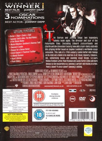 The excellent cast is filled out by Alan Rickman as the villainous Judge Turpin, Timothy Spall as his seedy Beadle, Sacha Baron Cohen as a rival barber, Jamie Campbell Bower as the young lover Anthony, Jayne Wisener as his object of affection, and Ed Sanders as the young Toby. For fans of Tim Burton and Johnny Depp who don't think they like musicals, Sweeney Todd should be a revelation (though not for the squeamish, as the gore is intense and completely appropriate). For fans of Broadway and Sondheim, it's hard to imagine getting a better adaptation than this. The fact that there's no newly composed Oscar-bait song sung by a Josh Groban-type over the end credits only makes it better. --David Horiuchi