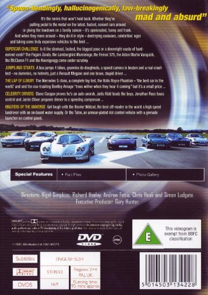 Having ceased to take itself seriously, Top Gear has now become the definitive weekly fantasy fix for petrol-heads everywhere. This compilation from the first and second series of the revamped show is mainly a chunk of four-wheeled fun that descends, more than occasionally, into downright silliness. Who would have it any other way? Unusually though, the cars are very nearly upstaged by the string of surprisingly good celebs who are wheeled on to fill the guest slot. We get Jay Kay, Harry Enfield, Jodie Kidd, Anne Robinson and many other luminaries. Several make genuinely funny contributions to the show, such as Jamie Oliver (who sends himself up something rotten while trying to prepare a salad in the back of a VW camper van as it careers around a test track), Patrick Stewart (Clarkson: "You're the most famous guest we've had on". Stewart: "This must be a terrible show, then.") and Boris Johnson, who admits to once having used a mobile phone while riding a bicycle. In the midst of all this, the programme still somehow gets around to beating seven colours of brake fluid out of assorted Jags, Lambos, Astons and so on.