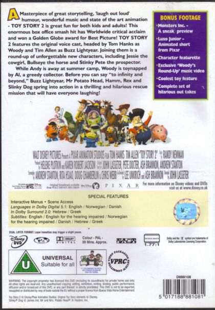 Although the toys look the same as in the 1994 feature, Pixar shows how much technology has advanced: the human characters look more human, backgrounds are superior, and two action sequences that book-end the film are dazzling. And it's a hoot for kids and adults. The film is packed with spoofs, easily accessible in-jokes and inspired voice casting (with newcomer Joan Cusack especially a delight as Cowgirl Jessie). But as the Pixar canon of films illustrates, the filmmakers are storytellers first. Woody's heart-tugging predicament can easily be translated into the eternal debate of living a good life versus living for forever. Toy Story 2 was deservedly a huge box-office success. --Doug Thomas, Amazon.com