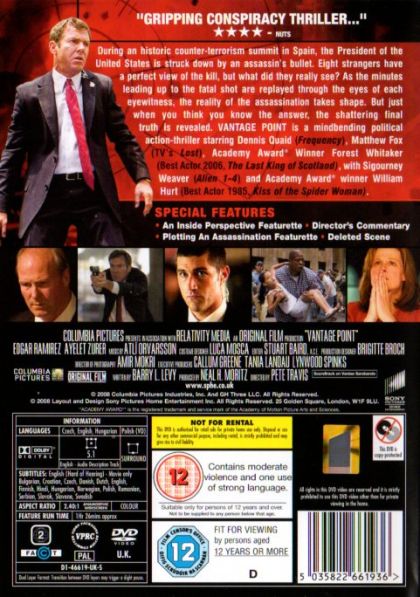 Agent Thomas Barnes (Dennis Quaid) and agent Taylor (Mathew Fox) are in the line of fire protecting the president of the United States, who is attending a global summit in Spain to resolve world terrorism. Agent Barnes had taken a bullet for his president a year ago. Amidst the tight security a shooter manages to take down the president followed by a series of bomb explosions through the venue. Mayhem breaks loose. The film loops over and over this situation explaining how the events unfold from the perspective of various people. People are blackmailed, conned and misled as the entire incident unfolds through the eyes of people involved. Rex Brooks (Sigourney Weaver) a television news producer visualizes the incident through her camera crew covering the summit. Howard Lewis (Forest Whitaker), an American tourist believes that he has captured the shooter on his video camera draws his attention to Agent Barnes who in the midst of all the chaos tries to get to the bottom of the conspiracy.