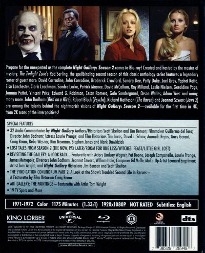 Night Gallery was creator-host Rod Serling's follow-up to The Twilight Zone. Set in a shadowy museum of the outre, Serling weekly unveiled disturbing portraiture as preface to a highly diverse anthology of tales in the fantasy-horror vein. Bolstering Serling's thoughtful original dramas were adaptations of classic genre material--short stories by such luminaries as H. P. Lovecraft, Fritz Leiber, A.E. van Vogt, Algernon Blackwood, Conrad Aiken, Richard Matheson, August Derleth, and Christianna Brand. Variety of material brought with it a variety of tone, from the deadly serious to the tongue-in-cheek, stretching the television anthology concept to its very limits.