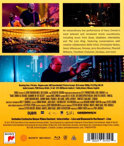 An extraordinary live performance of Hans Zimmer's most beloved and renowned movie soundtracks, including music from Dune, Gladiator, Interstellar, and The Lion King. Featuring conversations with creative collaborators Billie Eilish, Christopher Nolan, Denis Villeneuve, Finneas, Jerry Bruckheimer, Pharrell Williams, Timothée Chalamet, Zendaya, and more.