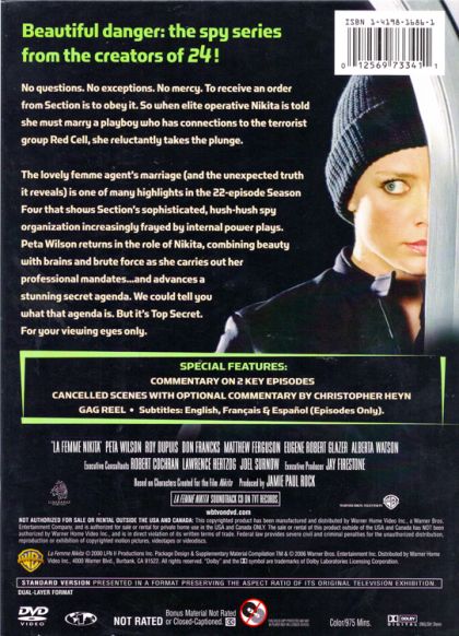 Based on the cult motion picture of the same name, the sexy, stylish spy series La Femme Nikita ran from 1997 to 2001 on the USA network. Starring Peta Wilson as Nikita, the series saw a young woman framed for murder and given a choice: be sentenced to life imprisonment, or work for Section One, a clandestine anti-terrorism organization. Nikita chose life, soon discovering that she is just the latest pawn in Section's games...