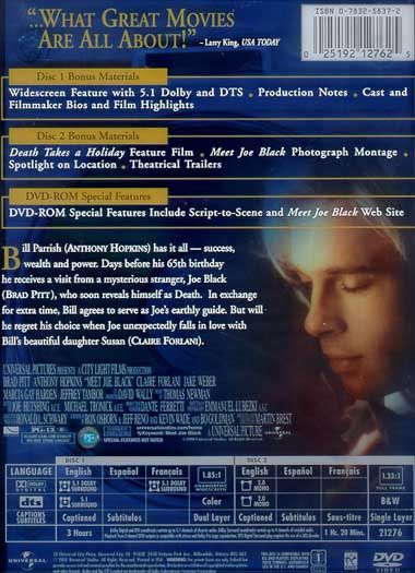Bill Parrish has it all - success, wealth and power. Days before his 65th birthday, he receives a visit from a mysterious stranger, Joe Black, who soon reveals himself as Death. In exchange for extra time, Bill agrees to serve as Joe's earthly guide. But will he regret his choice when Joe unexpectedly falls in love with Bill's beautiful daughter Susan?