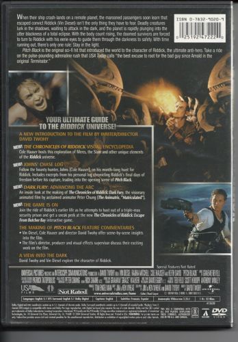 When their ship crash-lands on a remote planet, the marooned passengers soon learn that escaped convict Riddick isn't the only thing they have to fear. Deadly creatures lurk in the shadows, waiting to attack in the dark, and the planet is rapidly plunging into the utter blackness of a total eclipse. With the body count rising, the doomed survivors are forced to turn to Riddick with his eerie eyes to guide them through the darkness to safety. With time running out, there's only one rule: Stay in the light.