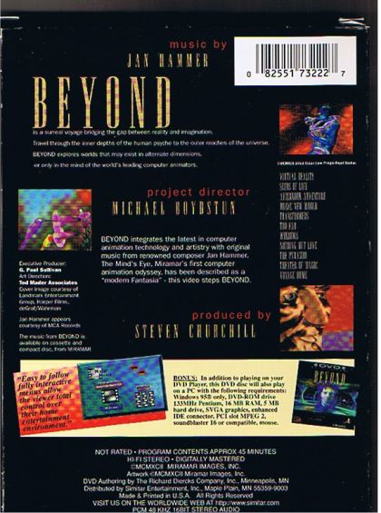 BEYOND integrates the latest in computer animation technology and artistry with original music from renowned composer Jan Hammer. The Mind's Eye, Miramar's first computer animation odyssey, has been described as a "modern Fantasia" - this video steps BEYOND.