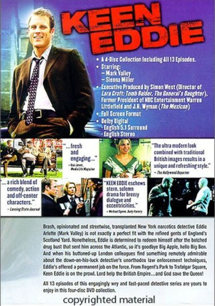 Filmed on-location in London, the FOX cop series Keen Eddie starred Mark Valley as Eddie Arlette, a New York City police detective. Disgraced and nearly dismissed after a spectacularly botched drug bust, Eddie was ordered to transfer to London's Scotland Yard so that he might rebuild his career from the ground up. Despite a daunting series of setbacks and blunders, Eddie managed to do his duty, with both himself and his Scotland Yard colleagues learning a lot more about one another's countries and cultures than they ever imagined.