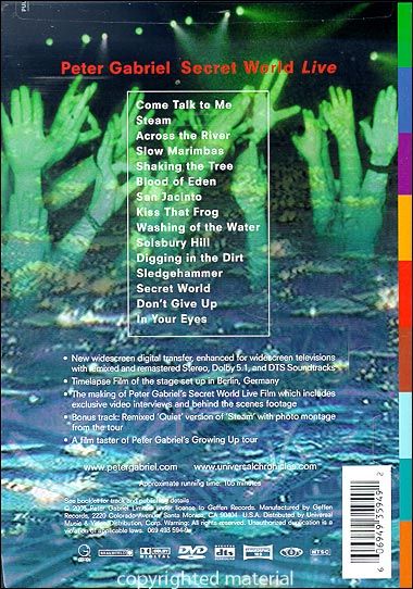 Filmed in Modena, Italy across two nights in November 1993 as part of Peter Gabriel's acclaimed Secret World Live tour in support of the Us album, the show is elaborately presented and choreographed with two stages joined by a narrow pier. Peter Gabriel has always been a charismatic live performer with the ability to draw his audience into the onstage world he has created and rarely has this been better captured than on Secret World Live.