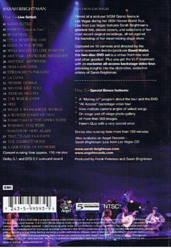 Renowned vocalist Sarah Brightman performs more than 20 songs before a packed house at Las Vegas' MGM Grand Arena in this concert film from Angel Records. The set list includes such tunes as "Who Wants to Live Forever," "Stranger in Paradise," "What a Wonderful World," "A Whiter Shade of Pale," and "Wishing You Were Somehow Here Again."