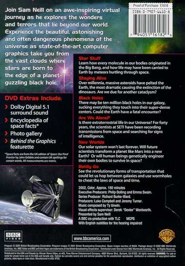 Join Sam Neill on an awe-inspiring virtual journey as he explores the wonders and terrors that lie beyond our world. Experience the beautiful astonishing and often dangerous phenomena of the universe as state-of-the-art computer graphics take you from the vast clouds where stars are born to the edge of a planet-guzzling black hole.