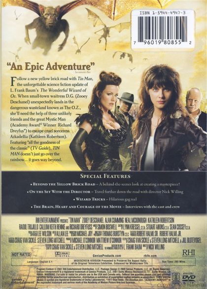 Set in the spirit of L. Frank Baum's classic, the "Tin Man" follows the adventures of DG, a waitress and part-time student, as she travels through the mystical world of "The O. Z. (Outer Zone)", discovering her hidden past. This well-known story takes a twist in this SyFy adaptation as DG battles the sorceress Azkadellia along with the help of four friends; Glitch, a former adviser to the Queen whose brain has been removed; Raw, a psychic empath; and Wyatt Cain, a former police man (aka Tin-man) who has been imprisoned in an iron suit, forced to watch his family's destruction time and time again. Although parallels can be made to the original book this story takes its own path down the yellow brick road.