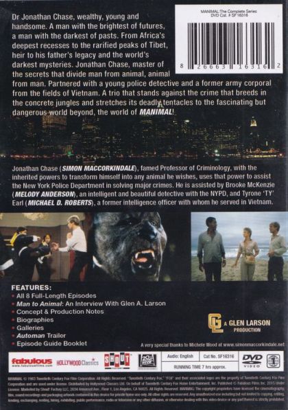 "Dr. Jonathan Chase - wealthy, young, handsome. A man with the brightest of futures. A man with the darkest of pasts. From Africa's deepest recesses, to the rarest peaks of Tibet. Heir to his father's legacy and the worlds darkest mysteries...Jonathan Chase, master of the secrets that divide man from animal, animal from man, Manimal."