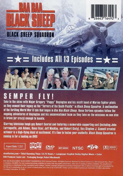 Loosely based on the memoirs of Major Greg "Pappy" Boyington who led one of the most famous Marine Corps fighter squadron of World War 2: Fighting Squadron 214, nicknamed the "Black Sheep" squadron. Based in the South Pacific, the rag-tag Corsair flying misfits is led by "Pappy" Boyington, played by Robert Conrad. The opening credits read: In World War II Marine Corps Major Greg "Pappy" Boyington commanded a squadron of fighter pilots. They were a collection of misfits and screwballs who became the terrors of the South Pacific. They were known as the Black Sheep