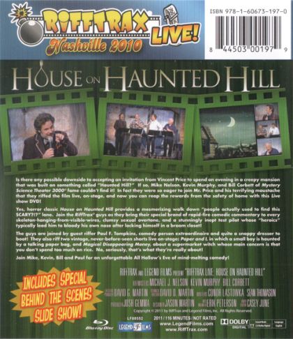 Is there any possible downside to accepting an invitation from Vincent Price to spend an evening in a creepy mansion that was built on something called “Haunted Hill?” If so, Mike, Kevin and Bill couldn’t find it! In fact they were so eager to join Mr. Price and his terrifying moustache that they riffed the film live, on-stage, and now you can reap the rewards from the safety of home with this live show DVD! Yes, horror classic House on Haunted Hill provides a mesmerizing walk down “people actually used to find this SCARY?!?” lane. Join the RiffTrax guys as they bring their special brand of rapid-fire comedic commentary to every skeleton-hanging-from-visible-wires, clumsy sexual overtone, and a stunningly inept test pilot whose “heroics” typically lead him to bloody his own nose after locking himself in a broom closet! The guys are joined by guest riffer Paul F. Tompkins, comedy person extraordinaire and quite a snappy dresser to boot!
