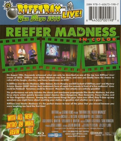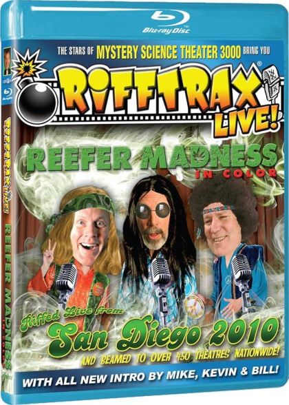 On August 19th, thousands witnessed what can only be described as one of the top two RiffTrax Live events of 2010. RiffTrax Live: Reefer Madness was that show, and now you finally have the chance to relive all the laughs, chortles, and fancy headresses on DVD! In RiffTrax Live: Reefer Madness, Mike, Kevin and Bill deliver their trademark form of rapid fire comedy in front of a live audience! Lines could be flubbed! Tomatoes could be thrown! Mountain lion attacks are entirely possible! The performance not only includes the classic anti-marijuana propaganda film Reefer Madness, but also three shorts which quickly became instant classics: More Dangerous Than Dynamite, Frozen Frolics, and At Your Fingertips: Grasses. Among the most insane things the guys have ever riffed, they’ll clear up any questions you might have about washing your clothes in gasoline and whether corn is grass.