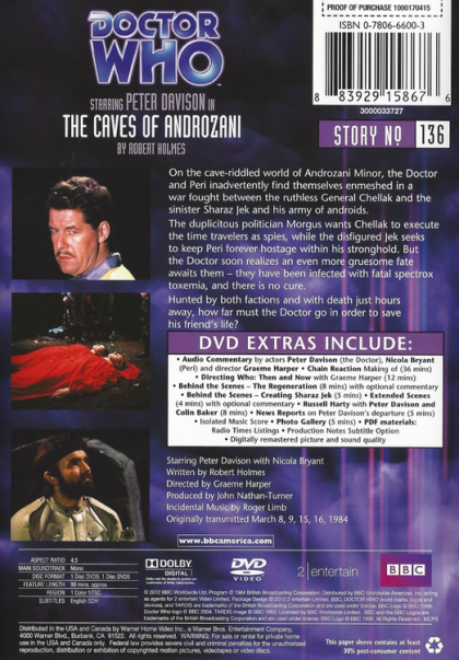 The planet Androzani Minor, the distant future. In the planets' caves war rages between government troops and the android warriors of the mysterious Sharaz Jek. But what makes spectrox, the substance they battle to control, so valuable? And how far will the Doctor go to protect his companion?