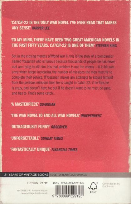 Explosive, subversive, wild and funny, 50 years on the novel's strength is undiminished. Reading Joseph Heller's classic satire is nothing less than a rite of passage. Set in the closing months of World War II, this is the story of a bombardier named Yossarian who is frantic and furious because thousands of people he has never met are trying to kill him. His real problem is not the enemy - it is his own army which keeps increasing the number of missions the men must fly to complete their service. If Yossarian makes any attempts to excuse himself from the perilous missions then he is caught in Catch-22: if he flies he is crazy, and doesn't have to; but if he doesn't want to he must be sane and has to. That's some catch...