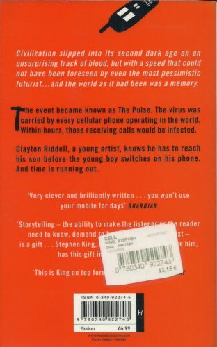 'Civilization slipped into its second dark age on an unsurprising track of blood but with a speed that could not have been foreseen by even the most pessimistic futurist. By Halloween, every major city from New York to Moscow stank to the empty heavens and the world as it had been was a memory.' The event became known as The Pulse. The virus was carried by every cell phone operating within the entire world. Within ten hours, most people would be dead or insane. A young artist Clayton Riddell realises what is happening. And together with Tom McCourt and a teenage girl called Alice, he flees the devastation of explosive, burning Boston, desperate to reach his son before his son switches on his little red mobile phone...