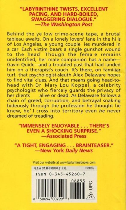 Behind the yellow crime-scene tape, a brutal tableau awaits. On a lonely lovers’ lane in the hills of Los Angeles, a young couple lies murdered in a car. Each victim bears a single gunshot wound to the head. Though the female remains unidentified, her male companion has a name -- Gavin Quick -- and a troubled past that had landed him on a therapist’s couch. It’s there, on familiar turf, that psychologist-sleuth Alex Delaware hopes to find vital clues. And that means going head-to-head with Dr. Mary Lou Koppel, a celebrity psychologist who fiercely guards the privacy of her clients . . . alive or dead. As Delaware follows a chain of greed, corruption, and betrayal snaking hideously through the profession he thought he knew, he’ll cross into territory even he never dreamed of treading.