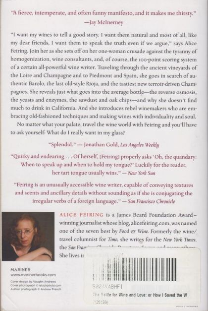 "I want my wines to tell a good story. I want them natural and most of all, like my dear friends, I want them to speak the truth even if we argue," says Alice Feiring. Join her as she sets off on her one-woman crusade against the tyranny of homogenization, wine consultants, and, of course, the 100-point scoring system of a certain all-powerful wine writer. Traveling through the ancient vineyards of the Loire and Champagne, to Piedmont and Spain, she goes in search of authentic barolo, the last old-style rioja, and the tastiest new terroir-driven champagnes. She reveals just what goes into the average bottle--the reverse osmosis, the yeasts and enzymes, the sawdust and oak chips--and why she doesn't find much to drink in California. And she introduces rebel winemakers who are embracing old-fashioned techniques and making wines with individuality and soul. No matter what your palate, travel the wine world with Feiring and you'll have to ask yourself: What do i really want in my glass?