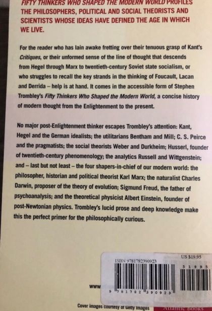 The development of modern thought is traced through a sequence of accessible profiles of the most influential thinkers in every domain of intellectual endeavor since 1789No major representative of post-Enlightenment thought escapes Trombley's attention in this history: the German idealists Kant, Fichte, Schelling, and Hegel; the utilitarians Bentham and Mill; the transcendentalists Emerson and Thoreau; Kierkegaard and the existentialists; founders of new fields of inquiry such as Weber, Durkheim, and C.S. Peirce; the analytic philosophers Russell, Moore, Whitehead, and Wittgenstein; political leaders from Mohandas K. Gandhi to Adolf Hitler; and--last but not least--the four shapers-in-chief of our modern world: the philosopher, historian, and political theorist Karl Marx; the naturalist Charles Darwin, proposer of the theory of evolution; Sigmund Freud, the father of psychoanalysis; and the theoretical physicist Albert Einstein, begetter of the special and general theories of relativity and founder of post-Newtonian physics. This book offers a crisp analysis of their key ideas, and in some cases a reevaluation of their importance as we proceed into the 21st century.