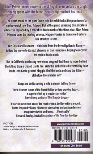 "Allan Prime looked ready to die of fright, even before the bright, shining spear with the blood-soaked tip reached his head . . ." The death mask of the poet Dante is to be exhibited at the premiere of a controversial new film, Inferno. But at the grand unveiling this priceless artefact is replaced by a macabre death mask of the film's star, Allan Prime. Minutes later the leading actress, Maggie Flavier, is threatened before her attacker is shot. Nic Costa and his team are sidelined from the investigation in Rome and follow the movie to its next showing in San Francisco, hoping to recover the stolen death mask. But in California confusing new clues suggest that there is more behind the killing than a crazed Dante fan. With the authorities distracted by false leads, can Costa protect Maggie, find the truth and stop the killer - all before life imitates art? 'Hewson writes a page-turner detective story like no other' " Choice"