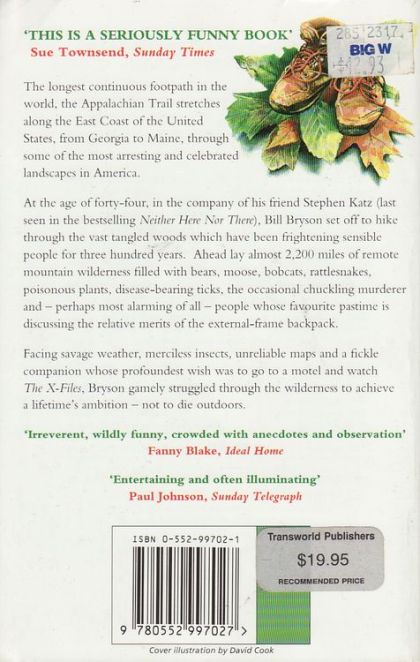 The longest continuous footpath in the world, the Appalachian Trail stretches along the East Coast of the United States, from Georgia to Maine, through some of the most arresting and celebrated landscapes in America. At the age of forty-four, in the company of his friend Stephen Katz (last seen in the bestselling Neither Here nor There), Bill Bryson set off to hike through the vast tangled woods which have been frightening sensible people for three hundred years. Ahead lay almost 2,200 miles of remote mountain wilderness filled with bears, moose, bobcats, rattlesnakes, poisonous plants, disease-bearing tics, the occasional chuckling murderer and - perhaps most alarming of all - people whose favourite pastime is discussing the relative merits of the external-frame backpack. Facing savage weather, merciless insects, unreliable maps and a fickle companion whose profoundest wish was to go to a motel and watch The X-Files, Bryson gamely struggled through the wilderness to achieve a lifetime's ambition - not to die outdoors.