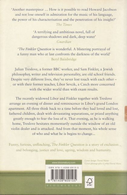 ‘He should have seen it coming. His life had been one mishap after another. So he should have been prepared for this one...’ Julian Treslove, a professionally unspectacular former BBC radio producer, and Sam Finkler, a popular Jewish philosopher, writer and television personality, are old school friends. Despite a prickly relationship and very different lives, they’ve never quite lost touch with each other – or with their former teacher, Libor Sevcik, a Czech always more concerned with the wider world than with exam results. Now, both Libor and Finkler are recently widowed, and with Treslove, his chequered and unsuccessful record with women rendering him an honorary third widower, they dine at Libor’s grand, central London apartment. It’s a sweetly painful evening of reminiscence in which all three remove themselves to a time before they had loved and lost; a time before they had fathered children, before the devastation of separations, before they had prized anything greatly enough to fear the loss of it. Better, perhaps, to go through life without knowing happiness at all because that way you have less to mourn? Treslove finds he has tears enough for the unbearable sadness of both his friends’ losses.And it’s that very evening, at exactly 11:30 pm, as Treslove, walking home, hesitates a moment outside the window of the oldest violin dealer in the country, that he is attacked. And after this, his whole sense of who and what he is will slowly and ineluctably change. The Finkler Question is a scorching story of friendship and loss, exclusion and belonging, and of the wisdom and humanity of maturity. Funny, furious, unflinching, this extraordinary novel shows one of our finest writers at his brilliant best.