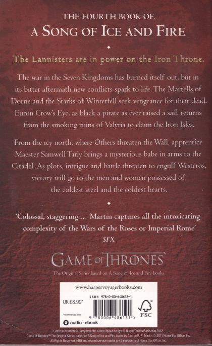 Few books have captivated the imagination and won the devotion and praise of readers and critics everywhere as has George R. R. Martin's monumental epic cycle of high fantasy. Now, in A Feast for Crows, Martin delivers the long-awaited fourth book of his landmark series, as a kingdom torn asunder finds itself at last on the brink of peace...only to be launched on an even more terrifying course of destruction. A Feast for Crows It seems too good to be true. After centuries of bitter strife and fatal treachery, the seven powers dividing the land have decimated one another into an uneasy truce. Or so it appears....With the death of the monstrous King Joffrey, Cersei is ruling as regent in King's Landing. Robb Stark's demise has broken the back of the Northern rebels, and his siblings are scattered throughout the kingdom like seeds on barren soil. Few legitimate claims to the once desperately sought Iron Throne still exist--or they are held in hands too weak or too distant to wield them effectively. The war, which raged out of control for so long, has burned itself out. But as in the aftermath of any climactic struggle, it is not long before the survivors, outlaws, renegades, and carrion eaters start to gather, picking over the bones of the dead and fighting for the spoils of the soon-to-be dead. Now in the Seven Kingdoms, as the human crows assemble over a banquet of ashes, daring new plots and dangerous new alliances are formed, while surprising faces--some familiar, others only just appearing--are seen emerging from an ominous twilight of past struggles and chaos to take up the challenges ahead. It is a time when the wise and the ambitious, the deceitful and the strongwill acquire the skills, the power, and the magic to survive the stark and terrible times that lie before them. It is a time for nobles and commoners, soldiers and sorcerers, assassins and sages to come together and stake their fortunes...and their lives. For at a feast for crows, many are the guests--but only a few are the survivors.