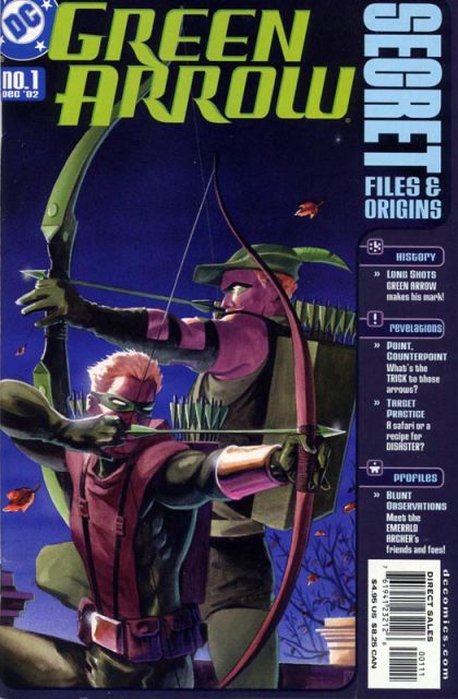 WRITTEN BY JUDD WINICK, DAN CURTIS JOHNSON AND SCOTT MCCULLAR; ART BY DIEGO BARRETO, KELLY YATES, PHIL HESTER, ANDE PARKS, ROBIN RIGGS, MICK GRAY, AND VARIOUS; PAINTED COVER BY MATT WAGNER In stores October 23. The secrets of the Emerald Archer are revealed in a bullseye-piercing double-sized one-shot! In the lead story, discover the history of Oliver Queen - both before and after his death (written by Judd Winick with art by Diego Barreto & Robin Riggs). Plus, Ollie discovers that the government is keeping tabs on super-heroes in the form of the D.E.O. (written by Dan Curtis Johnson & J.H. Williams III, with art by Kelly Yates & Mick Gray). Rounding out this Special are a look at Ollie's astounding arsenal, and profile pages showcasing Green Arrow, his allies, and his enemies illustrated by the fan-favorite team of Phil Hester & Ande Parks; and more! FC, 64 PG. $4.95 Cover price $4.95.