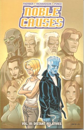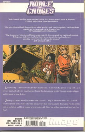 trade paperback full color; 120 pages written by JAY FAERBER art & cover by FRAN BUENO IN COLOR FOR THE FIRST TIME! Journey to a world where the Nobles aren't famous: They're infamous! Frost and Liz meet twisted versions of the world's favorite heroes when they enter a parallel dimension. Frost is on the trail of his father, and Liz is hoping to be reunited with Race, but neither is prepared for what they find! Collects Noble Causes: Distant Relatives #1-4, plus a brand new six-page story!