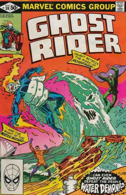 Ghost Rider hits Chicago! He toys with the police before encountering, and soundly beating, the hapless Water Wizard. As the Rider roars off laughing, a face forms in a water barrel - Moondark! Moondark will enhance the Water Wizard; together they can defeat the demon. Meanwhile, Johnny must contend with a pair of bikers who find him an easy mark, and are disappointed! The Water Wizard attacks again, but now his creations are immune to Ghost Rider's fire! Until Moondark, whose power created them, cannot resist materializing to gloat. The creatures may be immune, but Moondark isn't - he's still weak from their previous encounter, and flees when Ghost Rider attacks. Moondark's magic withdrawn causes Water Wizard to lose control of his monster, which attacks hero and villain alike! Fortunately, it's no longer immune to hellfire - and neither is the Water Wizard, who is left screaming and screaming as the Ghost Rider races away, laughing!