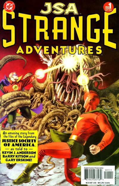 Written by Kevin J. Anderson Art by Barry Kitson & Gary Erskine Painted cover by John Watson Renowned science fiction novelist Kevin J. Anderson (THE SAGA OF SEVEN SUNS: VEILED ALLIANCES) comes to the DCU for this 6-issue miniseries starring the World's First Super-Team! Set during the Golden Age, STRANGE ADVENTURES begins when fumbling Johnny Thunder decides to become a big-time pulp writer by chronicling the adventures of the JSA. Taken under the writing wing of legendary, real-life science-fiction Grand Master Jack Williamson, Johnny tries his best ? and when a deadly new villain called Lord Dynamo appears on the scene, flying a deadly zeppelin crewed by robot zombies, it's up to Johnny and Jack to help Hawkman, the Flash, Green Lantern, Starman, Dr. Mid-Nite, Sandman and the rest of the JSA save the day! Cover price $3.50.