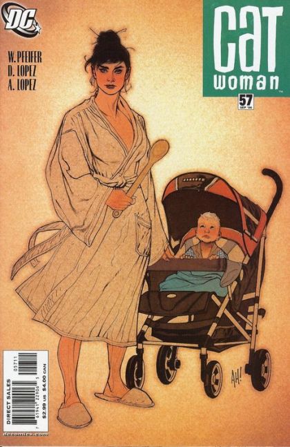 THEN: Selina painstakingly constructs the Irina Dubrovna herself, as she cannot trust those from whom she might purchase a new identity. NOW: Angle Man and Film Freak have traced her through that identity, and now threaten Helena, all so Film Freak can make art. Selina kills the light and has an advantage thanks to night vision goggles. But before she can escape Angle Man catches her with a razor sharp angle, and Film Freak recovers his camera, so the fight scene can resume. Holly and Wildcat play cards on a roof, when Green Lantern appears and collects Wildcat - the JSA needs him to help defeat Per Degaton! As Holly heads home, someone follows her. And makes a call. When Film Freak approaches for a "trombone shot" Catwoman injures him and shatters his camera. With superhuman effort she manages to plant a boot in Angle Man's stomach. Then she calls Holly, who has problems of her own: the call was to Lenahan, and he has the drop on her, and means to see her pay for the murder of Black Mask. Angle Man taunts Selina, telling her she's finished because they'll always be able to find her. Selina contacts Zatanna, who owes her...