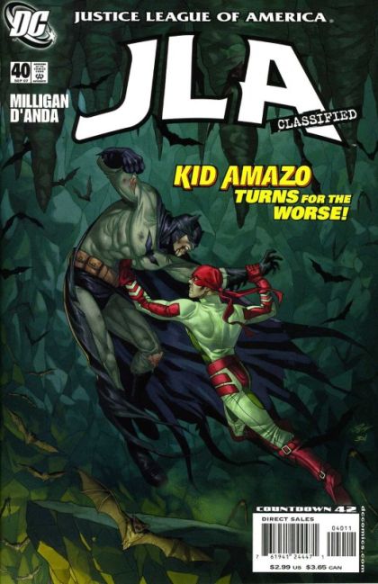 Enraged that Wonder Woman told his girlfriend of his powers, Kid Amazo tracks down the League and listens to them debate whether he's good or bad.He later rejects the good work he has done, publicly aiding various low level criminals before breaking into the Batcave where Batman has prepared a trap for him. Batman knew he would escape the trap quickly and they fight before he forces the Kid to escape.The Kid returns to his girlfriend and holds her hostage, demanding to speak to Wonder Woman but the whole League turn up and capture him, telling him there is something that he needs to know.