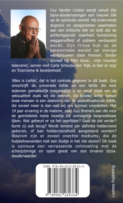 Guy Vander Linden werpt vanuit zijn bijna-doodervaringen een nieuwe blik op de spirituele wereld. Hij onderwerpt dogmas en aangenomen waarheden aan een kritische blik en stelt dat de achterliggende waarheid kunstzinnig weggemoffeld of subliem verdoezeld wordt . Zijn frisse kijk op de paranormale wereld zal menige wenkbrauwen doen fronsen. Eerder schreef hij Mijn dood... mijn mooiste belevenis, samen met Carla schouterden Kijk, ik ben er nog en Exorcisme & bezetenheid.Alles is Liefde, dat is het centrale gegeven in dit boek. Guy omschrijft de universele liefde als een liefde die voor iedereen gemakkelijk toegankelijk is en veraf staat van de seksualiteit zoals wij die kennen. De fysieke liefde tussen twee mensen is een deelvorm van de allesomvattende liefde, die zoveel meer is dan wat wij ons kunnen voorstellen. Met 19 jaar ervaring in de materie, pakt Guy themas aan die voor de gemiddelde mens moeilijk tot onmogelijk bespreekbaar lijken. Wat gebeurt er na het overlijden? Gaat de ziel verder? Komt zij ooit terug? Wordt iemand per definitie helderziend geboren, of kan helderziendheid aangeleerd worden? Waarom zijn er zoveel onechte mediums, die de hulpbehoevenden met een kluitje in het riet sturen? Dit boek is opnieuw een verrassende ontmoeting met de scherpzinnige en open geest van een ervaren bijnadoodervaarder.