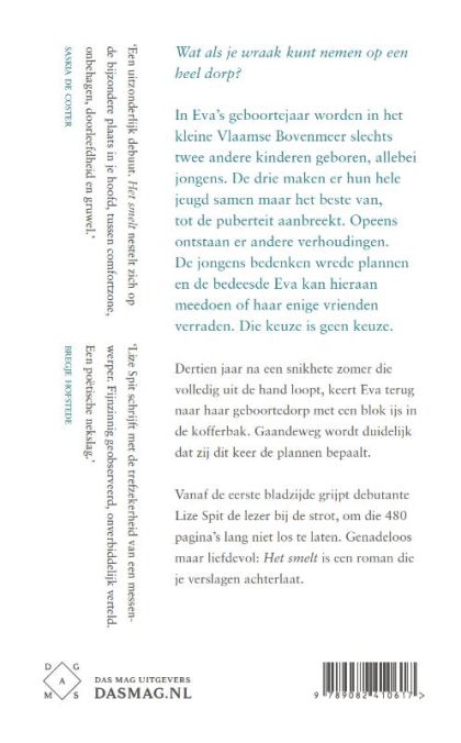 In Eva’s geboortejaar worden in het kleine Vlaamse Bovenmeer slechts twee andere kinderen geboren, allebei jongens. De drie maken er hun hele jeugd samen maar het beste van, tot de puberteit aanbreekt. Opeens ontstaan er andere verhoudingen. De jongens bedenken wrede plannen en de bedeesde Eva kan hieraan meedoen of haar enige vrienden verraden. Die keuze is geen keuze. Dertien jaar na een snikhete zomer die volledig uit de hand loopt, keert Eva terug naar haar geboortedorp met een blok ijs in de kofferbak. Gaandeweg wordt duidelijk dat zij dit keer de plannen bepaalt. Vanaf de eerste bladzijde grijpt debutante Lize Spit de lezer bij de strot, om die 480 pagina’s lang niet los te laten. Genadeloos maar liefdevol: Het smelt is een roman die je verslagen achterlaat.