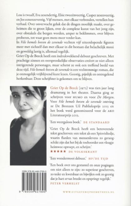 "Lou is twaalf, Eva zesendertig, Elsie tweeënveertig, Casper zesenveertig, en Jos eenenzeventig. Vijf mensen, met elkaar verbonden, vertellen hun verhaal. Over onverwacht geluk dat de dingen moeilijk maakt, over geheimen die te groot lijken, over de complexe kunst van het jong zijn, over obstakels die bergen worden, amper te beklimmen, over blijven proberen, tot waar geen mens meer verder kan. In Vele hemels boven de zevende vechten vijf uiteenlopende figuren meer met zichzelf dan met elkaar in dit bestaan dat belachelijk mooi en geweldig lastig is, allemaal tegelijk. Griet Op de Beeck heeft een indrukwekkend debuut geschreven. Met prachtige zinnen en oorspronkelijke observaties creëert ze niet alleen intrigerende personages, maar schetst ze ook een treffend beeld van deze tijd. Vele hemels boven de zevende is een veelstemmige roman, die je onmogelijk vrijblijvend kunt lezen. Geestig, pijnlijk en ontregelend herkenbaar. Deze schrijfster is gekomen om te blijven."--Dutch website.