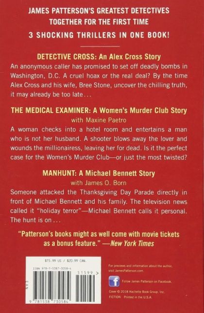 Alex Cross faces a D. C. bomb threat, the Women's Murder Club investigates a millionaire's death, and Michael Bennett hunts down a Thanksgiving Parade attacker in this collection of detective novels.Detective Cross: An Alex Cross Story: An anonymous caller has promised to set off deadly bombs in Washington, DC. A cruel hoax or the real deal? By the time Alex Cross and his wife Bree uncover the chilling truth, it may already be too late . . .The Medical Examiner: A Women's Murder Club Story (with Maxine Paetro): A woman checks into a hotel room and entertains a man who is not her husband. A shooter blows away the lover and wounds the millionairess, leaving her for dead. Is it the perfect case for the Women's Murder Club -- or just the most twisted?Manhunt: A Michael Bennett Story (with James O. Born): Someone attacked the Thanksgiving Day Parade right in front of Michael Bennett and his family. The news called it "holiday terror" -- Michael Bennett calls it personal. The hunt is on . . .