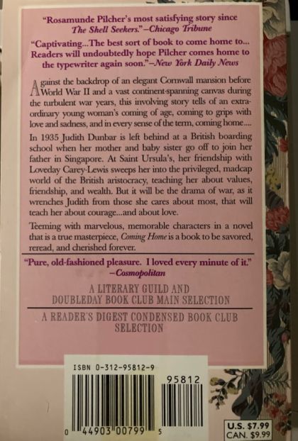 Against the backdrop of an elegant Cornwall mansion before World War II and a vast continent-spanning canvas during the turbulent war years, this involving story tells of an extraordinary young woman's coming of age, coming to grips with love and sadness, and in every sense of the term, coming home...In 1935, Judith Dunbar is left behind at a British boarding school when her mother and baby sister go off to join her father in Singapore. At Saint Ursula's, her friendship with Loveday Carey-Lewis sweeps her into the privileged, madcap world of the British aristocracy, teaching her about values, friendship, and wealth. But it will be the drama of war, as it wrenches Judith from those she cares about most, that will teach her about courage...and about love.Teeming with marvelous, memorable characters in a novel that is a true masterpiece, Rosamunde Pilcher's Coming Home is a book to be savored, reread, and cherished forever.