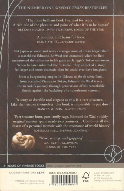 THE NUMBER ONE SUNDAY TIMES BESTSELLER WINNER OF THE 2010 COSTA BIOGRAPHY AWARD 264 wood and ivory carvings, none of them bigger than a matchbox: Edmund de Waal was entranced when he first encountered the collection in his great uncle Iggie's Tokyo apartment. When he later inherited the 'netsuke', they unlocked a story far larger and more dramatic than he could ever have imagined. From a burgeoning empire in Odessa to fin de siecle Paris, from occupied Vienna to Tokyo, Edmund de Waal traces the netsuke's journey through generations of his remarkable family against the backdrop of a tumultuous century. 'You have in your hands a masterpiece' Frances Wilson, Sunday Times 'The most brilliant book I've read for years... A rich tale of the pleasure and pains of what it is to be human' Bettany Hughes, Daily Telegraph, Books of the Year 'A complex and beautiful book' Diana Athill **ONE OF THE GUARDIAN'S 100 BEST BOOKS OF THE 21st CENTURY**