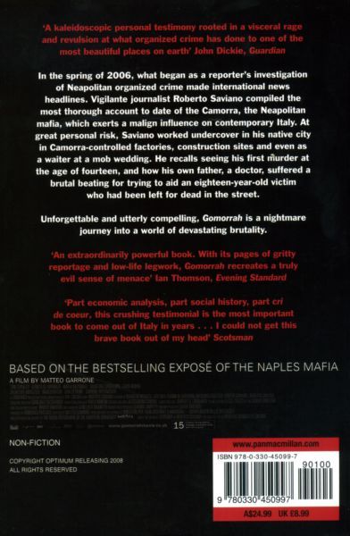 Gomorrah is a bold and important work of investigative writing that holds global significance. A groundbreaking, unprecedented bestseller in Italy, Roberto Saviano's gripping account traces the decline of Naples under the rule of organized crime. The Camorra is a network with an international reach and stakes in construction, high fashion, illicit drugs, and toxic waste disposal. Known by insiders as the System, it has infiltrated the economic and social fabric of the city and its region. A native of Naples, Saviano recalls seeing his first murder at the age of thirteen and remembers his own father, a doctor, suffering a brutal beating for trying to aid a teenage victim who had been left for dead in the street. In pursuit of his story, he infiltrates the System's work life and society. He investigates the Camorra's control of thousands of factories contracted to manufacture fashion goods, legally and illegally, for distribution around the world, and reveals how their abusive handling of toxic waste has created devastating pollution. Unique, brave, and graphic in detail, Gomorrah is one heroic young writer's impassioned story of a city --and a world--under the swa of a murderous organization.