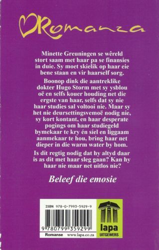 Minette Greuningen se wêreld stort saam met haar pa se finansies in duie. Sy moet skielik op haar eie bene staan en vir haarself sorg. Boonop dink die aantreklike dokter Hugo Storm met sy ysblou oë en selfs kouer houding net die erste van haar, selfs dat sy nie haar studies sal voltooi nie. Maar sy het nie deursettingsvermoë nodig nie, sy kort kontant, en haar desperate pogings om haar studiegeld bymekaar te kry en siel en liggaam aanmekaar te hou, bring haar net dieper in die warm water by hom. Is dit regtig nodig dat hy altyd daar is as dit met haar sleg gaan? Kan hy haar nie maar net uitlos nie?