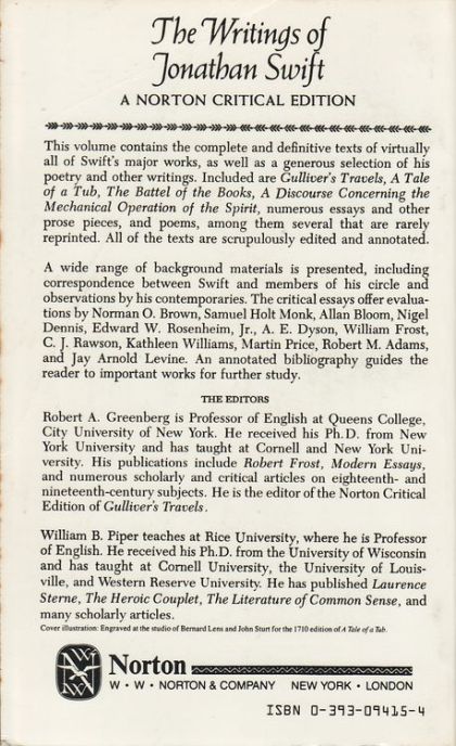 This volume contains the complete and definitive texts of virtually all of Swift's major works, as well as a generous selection of his poetry and other writings. Included are Gulliver's Travels, A Tale of a Tub, The Battel of the Books, A Discourse Concerning the Mechanical Operation of the Spirit, numerous essays and other prose pieces, and poems, among them several that are rarely reprinted. All of the texts are scrupulously edited and annotated.Backgrounds includes correspondence between Swift and members of his circle and observations by his contemporaries.Criticism offers evaluations by Norman O. Brown, Samuel Holt Monk, Allan Bloom, Nigel Dennis, Edward W. Rosenheim, Jr., A. E. Dyson, William Frost, C. J. Rawson, Kathleen Williams, Martin Price, Robert M. Adams, and Jay Arnold Levine.An Annotated Bibliography guides the reader to important works for further study.