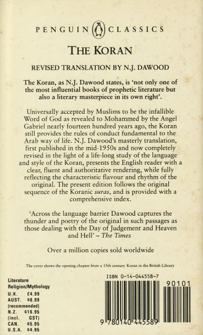 The Koran, as N. J. Dawood states, is 'not only one of the most influential books of prophetic literature but also a literary masterpiece in its own right'.Universally accepted by Muslims to be the infallible Word of God as revealed to Mohammed by the Angel Gabriel nearly fourteen hundred years ago, the Koran still provides the rules of conduct fundamental to the Arab way of life. N. J. Dawood's masterly translation, first published in the mid-1950s and now completely revised in the light of a life-long study of the language and style of the Koran, presents the English reader with a clear, fluent and authoritative rendering, while fully reflecting the characteristic flavour and rhythm of the original. The present edition follows the original sequence of the Koranic suras, and is provided with a comprehensive index.