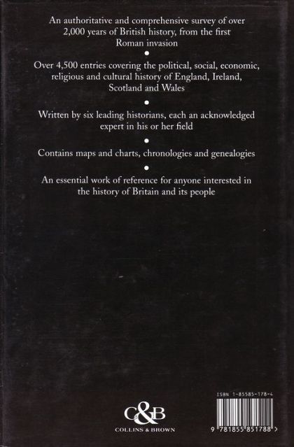 Six British historians contribute to a comprehensive dictionary which not only is a reference work for events, people and places from 43 AD, but also acknowledges that history is as much about the writing of what happened as what actually did happen. It also includes information on historical concepts and controversy. The contributors are Dr David Bates (University of Wales, College of Cardiff), John Gillingham (London School of Economics), Dr Diarmaid McCulloch (University of Bristol and University College London), Joanna Innes (Somerville College, Oxford), Dr David Englander (Open University) and Dr John Stevenson (Worcester College, Oxford).
